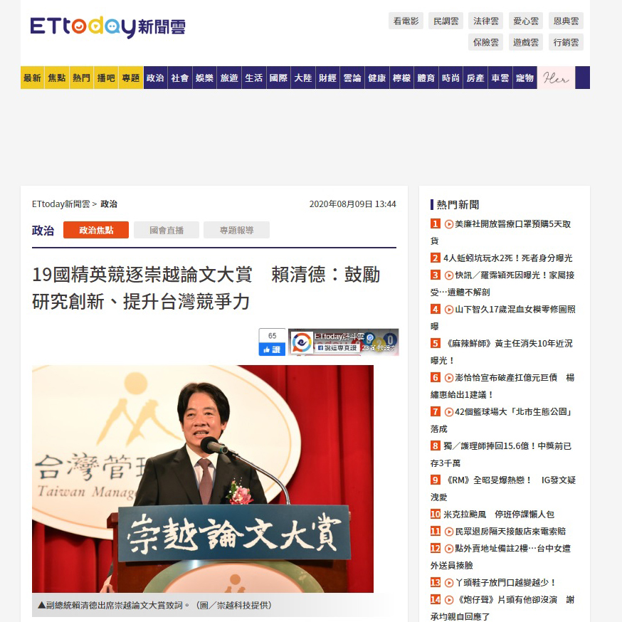 [媒體報導]19國精英競逐崇越論文大賞 賴清德:鼓勵研究創新、提升台灣競爭力